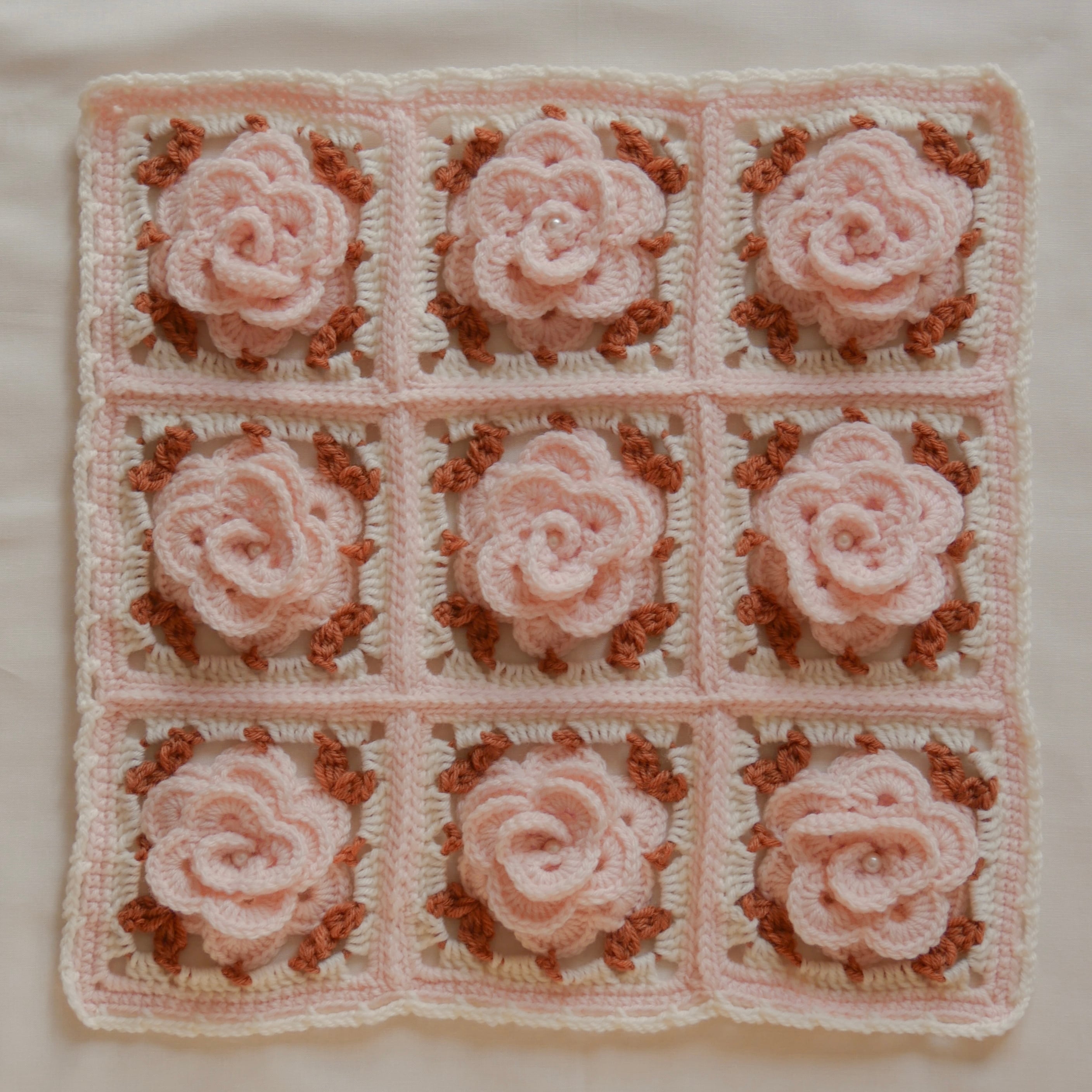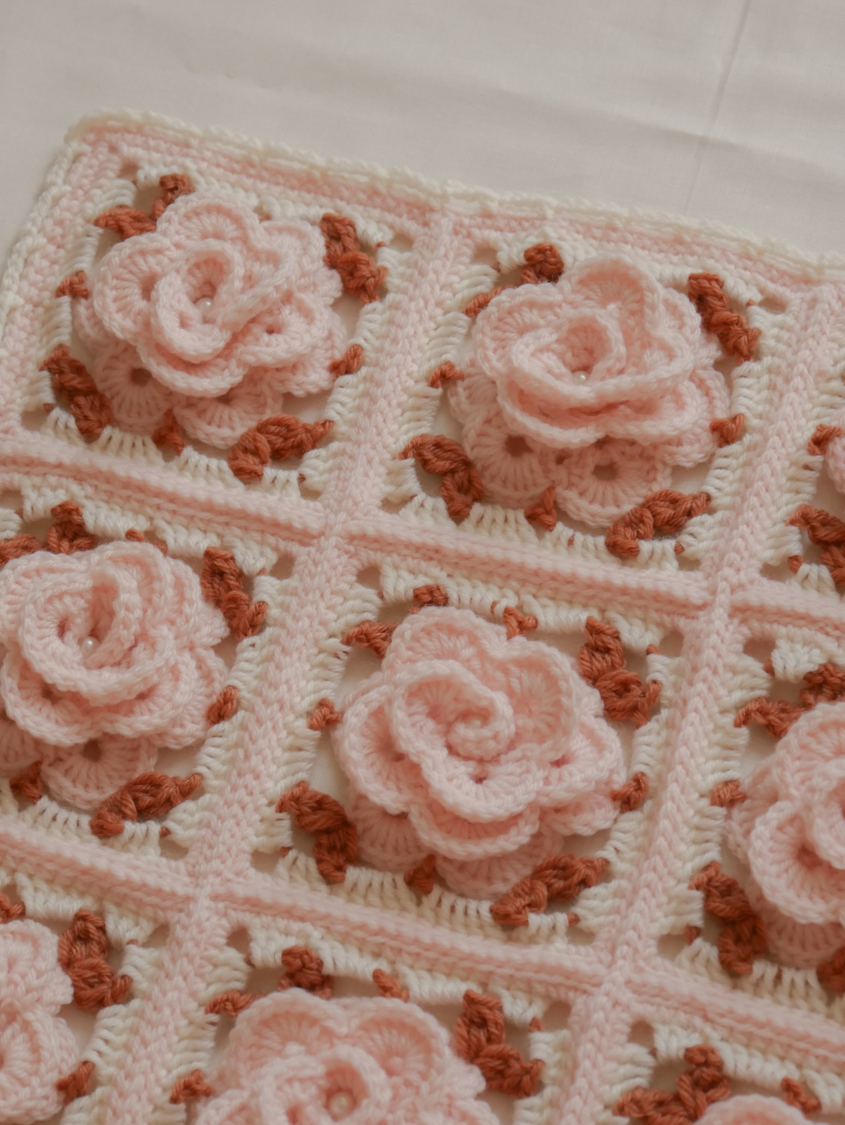 立体的なバラのモチーフを繋げたマルチカバーです。